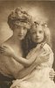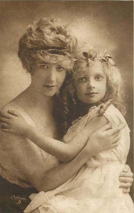 mother holds child in arms, mother to left, heads touch, girl's left hand on mother's right shoulder, mother's left hand on child's waist, mother's right hand just under childs left shoulder