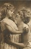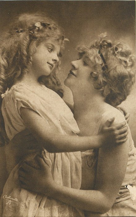 mother holds child in arms, mother to right, girls hands both on mother's left shoulder, mother's arms around girl, her right thumb not visable