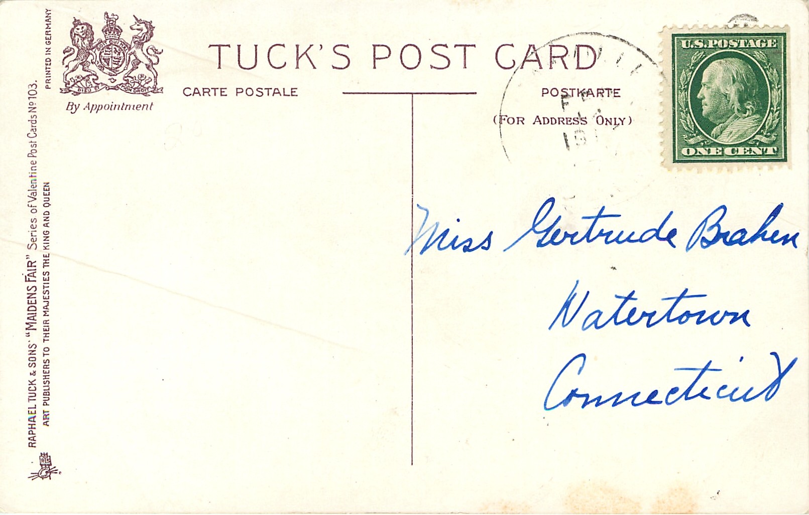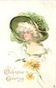 VALENTINE GREETING pretty girl in green bonnet looks left, yellow daisies below