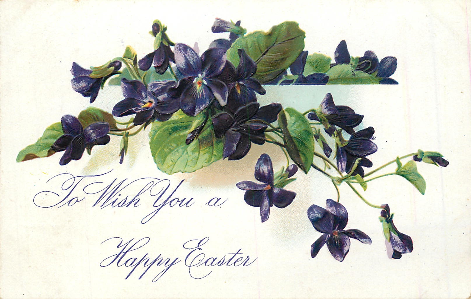 TO WISH YOU A HAPPY EASTER violets, violet flowers, plant appears to grow over side of stone wall