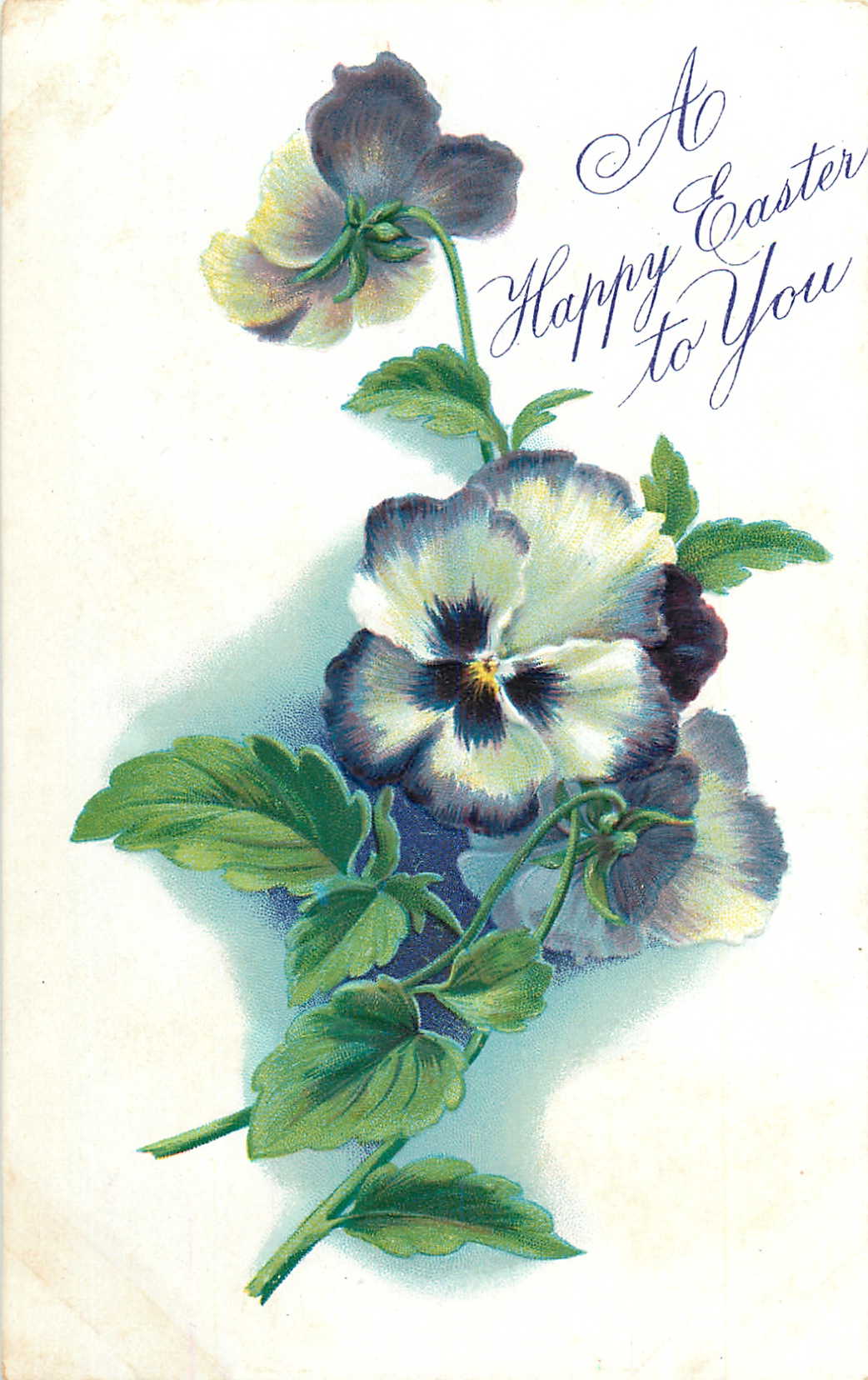 A HAPPY EASTER TO YOU pansies three blue/white blooms, upper & lower face away, two stems at lower left