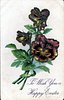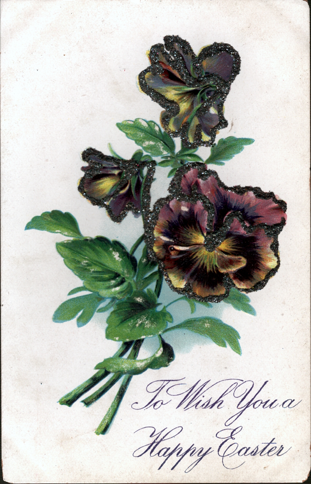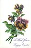 TO WISH YOU A HAPPY EASTER pansies, three purple/yellow blooms upper two face away, three stems at lower left