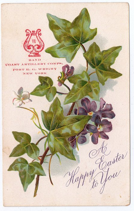 A HAPPY EASTER TO YOU violets & ivy leaves, four purple flowers, one bud, one leaf & stalk at bottom