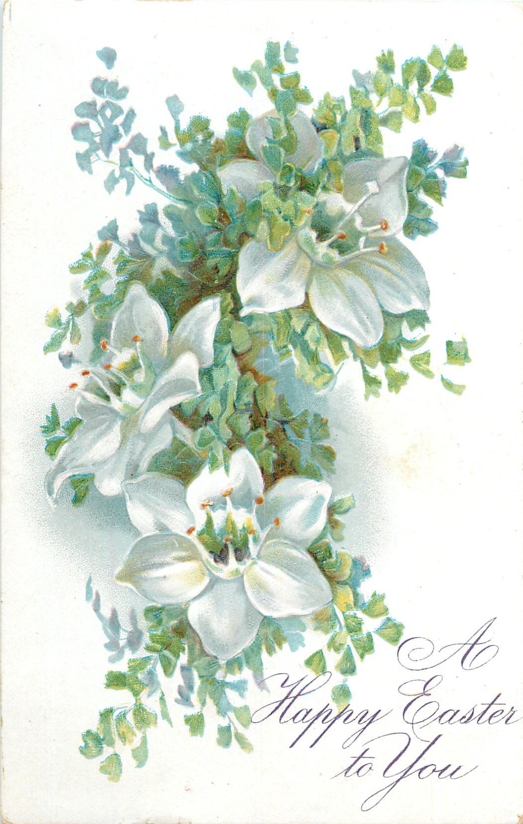 A HAPPY EASTER TO YOU hellebores, three white blooms among many small green leaves