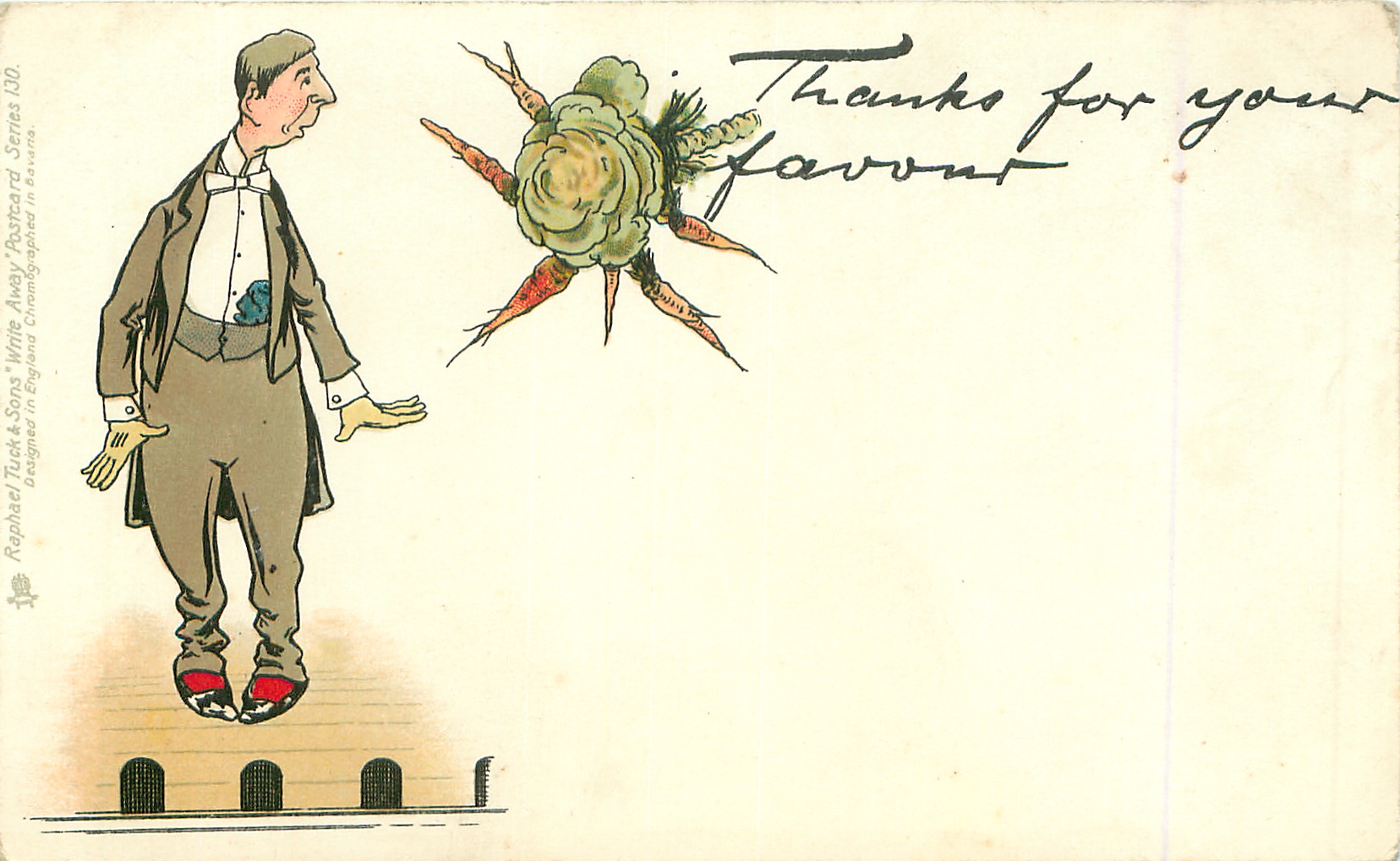 THANKS FOR YOUR FAVOUR entertainer pelted with bouquet of vegetables