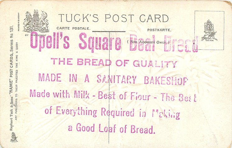 embossed, PRINTED IN SAXONY comes opt. in purple :-OPELL'S SQUARE DEAL BREAD THE BREAD OD QUALITY MADE IN A SANITARY BAKESHOP MADE WITH MILK--THE BEST OF FLOUR--THE BEST OF EVERYTHING REQUIRED IN MAKING A GOOD LOAF OF BREAD
