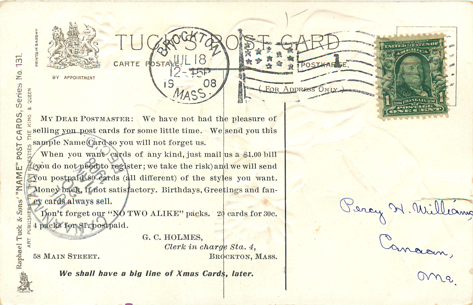 postcard ad. on back from G.C. HOLMES, BROCKTON, MASS
