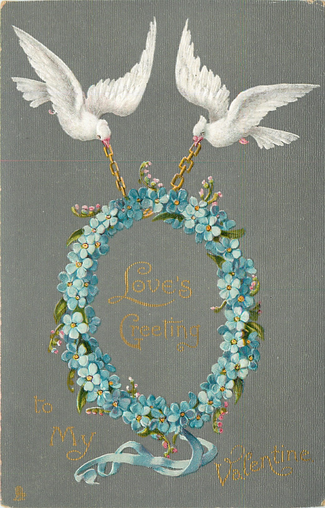 LOVE'S GREETING TO MY VALENTINE two white doves fly with garland of blue forget-me-nots