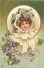 head & sholders study of girl in white bonnet tied under her chin, green bow above, faces front, violets below