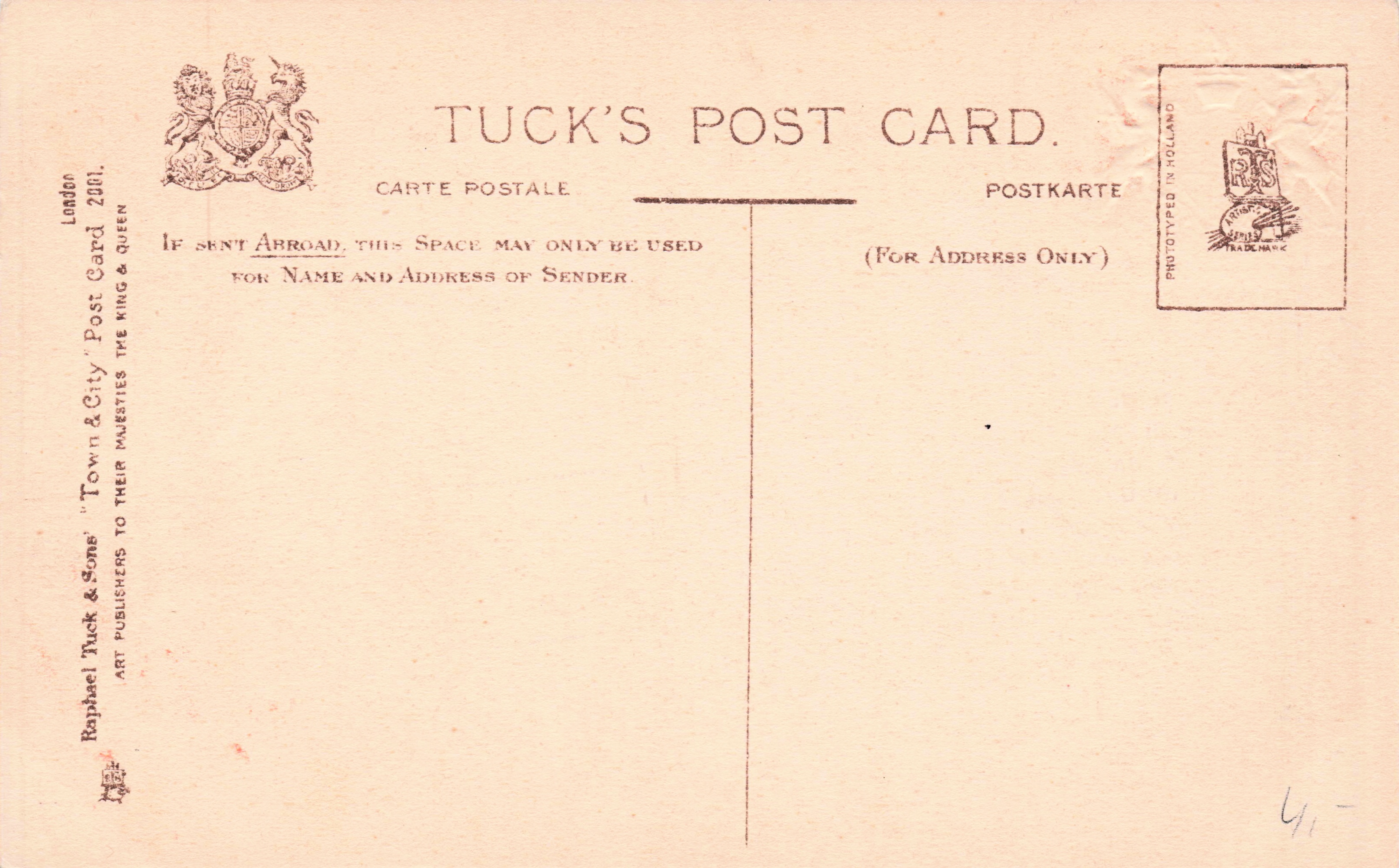 grey/black, TOWN & CITY, come PHOTOTYPED or PRINTED IN HOLLAND (in stamp box), 4 backs, set content varies, some images same as LONDON TOWN AND CITY 2000, come opt in red CITY ARMS, listed in 1904/1905 & 1911/1912 Postcard Catalogue, & as set of 12 in 1904 come unnumbered, possible Tuck error