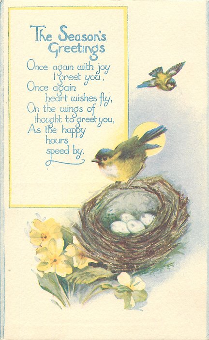 THE SEASON'S GREETINGS nest, four eggs, two blue-tits, primroses