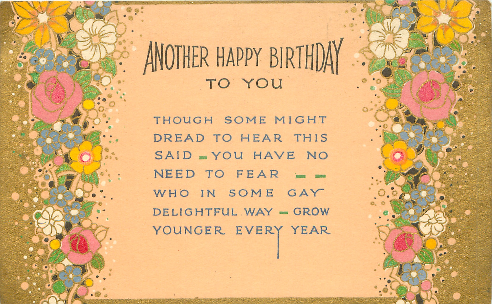 verse:- THOUGH SOME MIGHT DREAD TO HEAR THIS SAID-YOU HAVE NO NEED TO FEAR-WHO HAVE IN SOME GAY DELIGHTFUL WAY- GROW YOUNGER EVERY YEAR