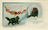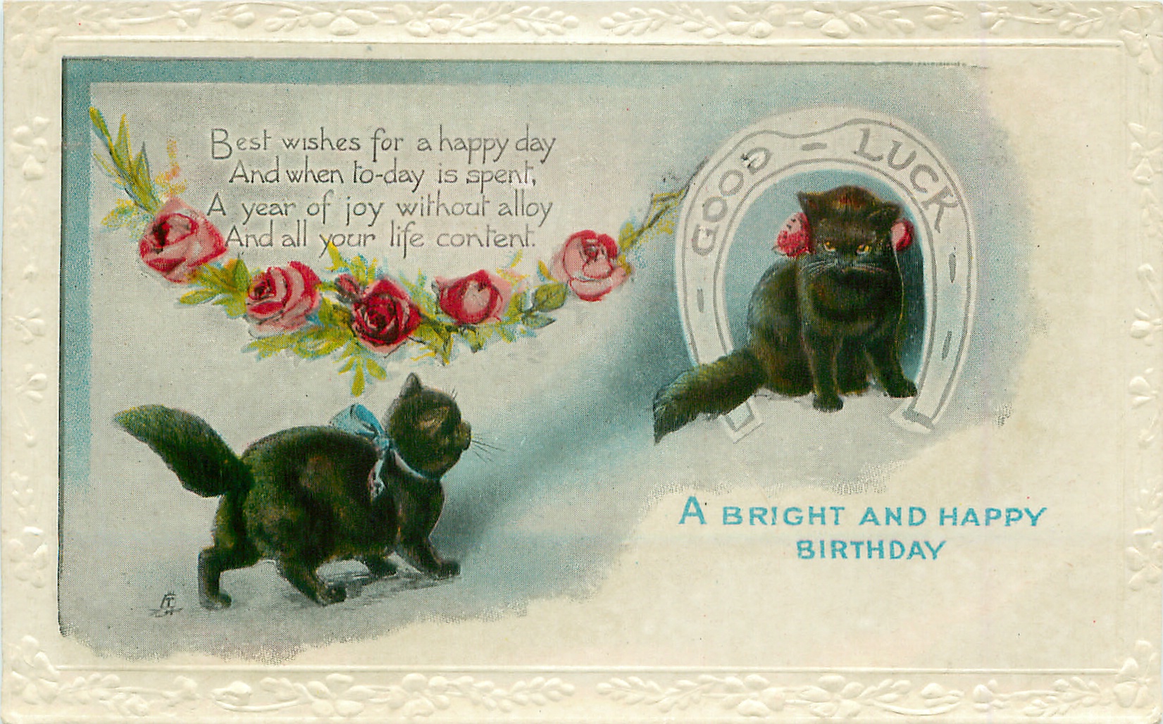 A BRIGHT AND HAPPY BIRTHDAY GOOD LUCK in horseshoe two black cats, red roses