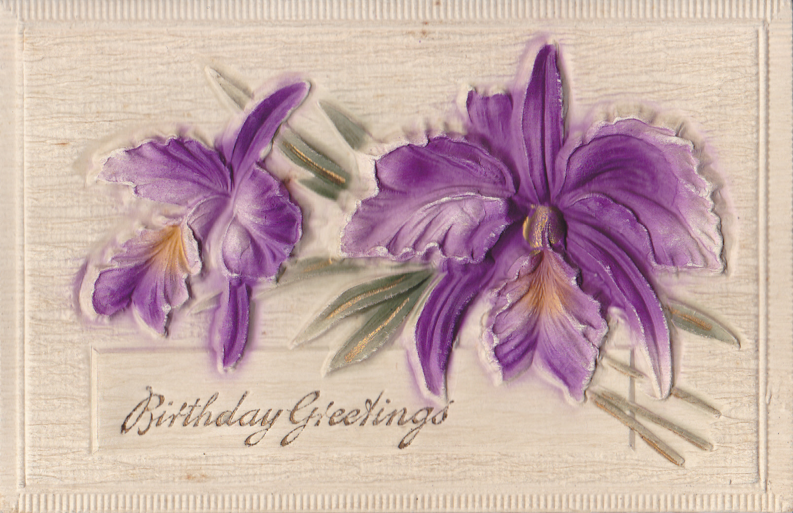 BIRTHDAY GREETINGS purple irises, stalks point to right lower corner