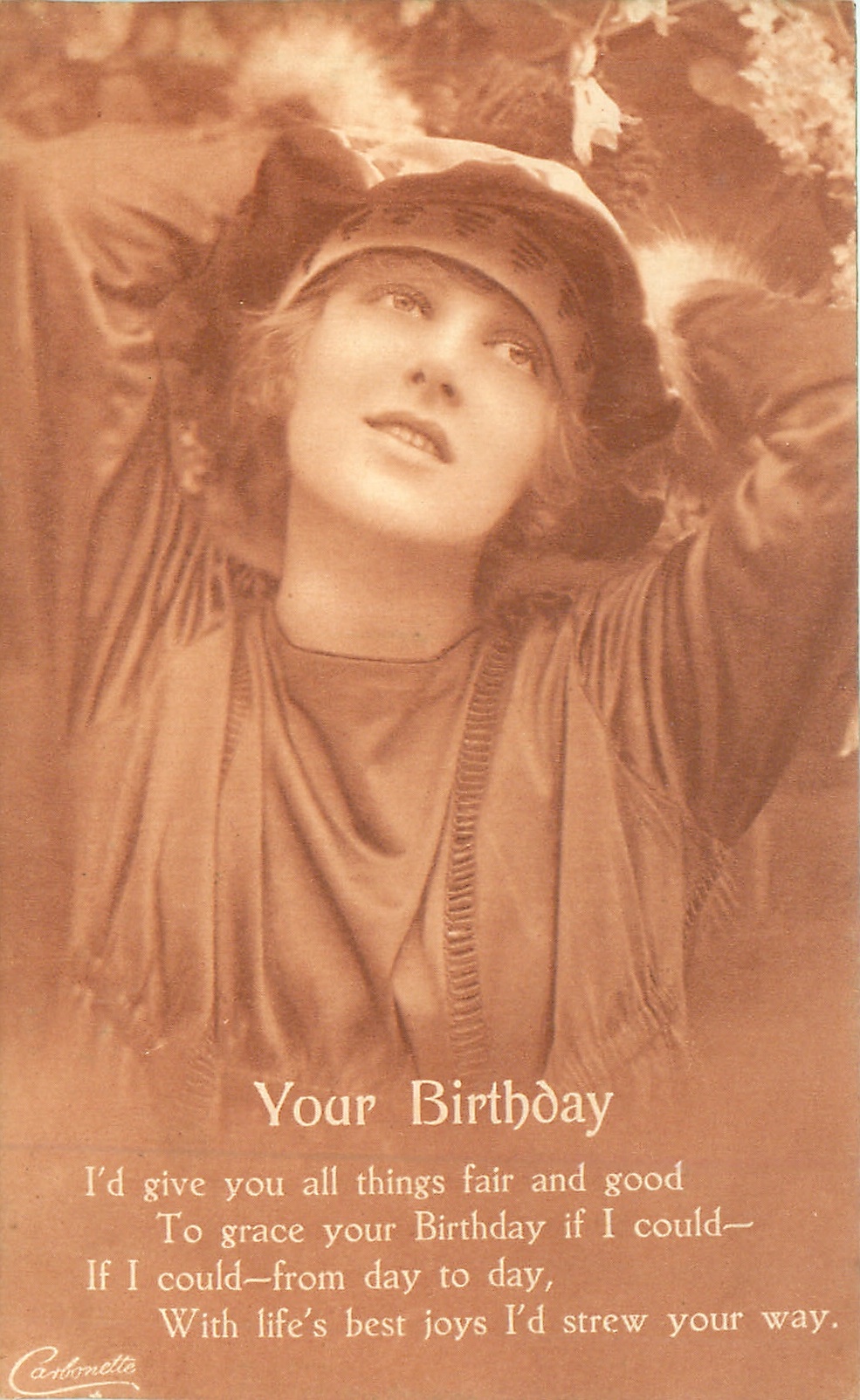 YOUR BIRTHDAY girl with hands behind her head, looks front & up