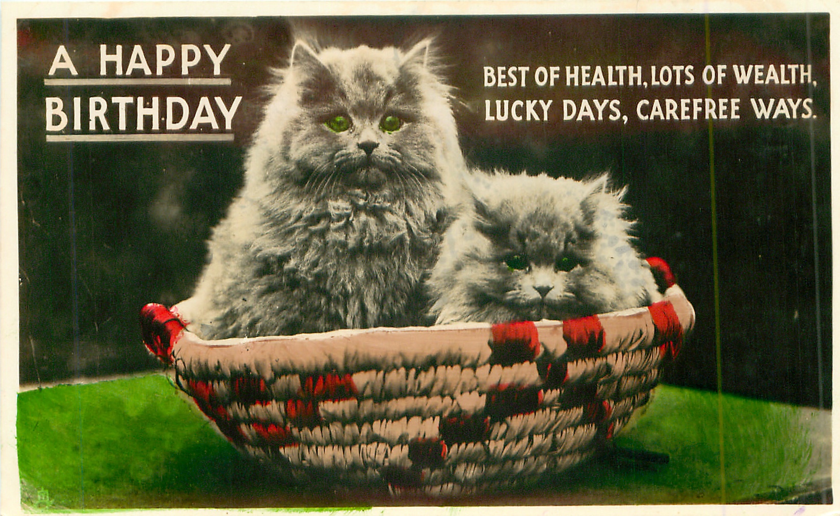 A HAPPY BIRTHDAY two white Persian cats in basket