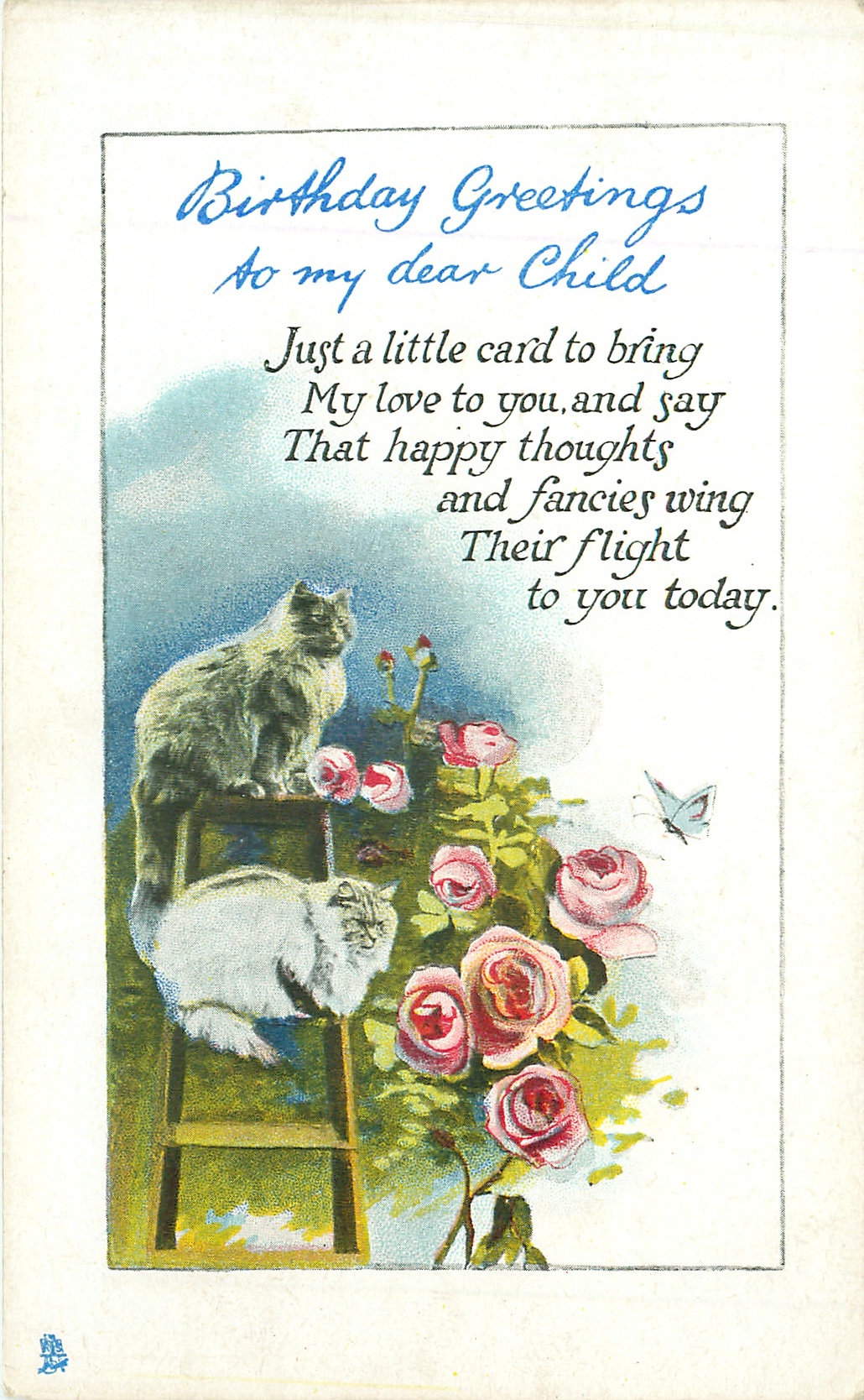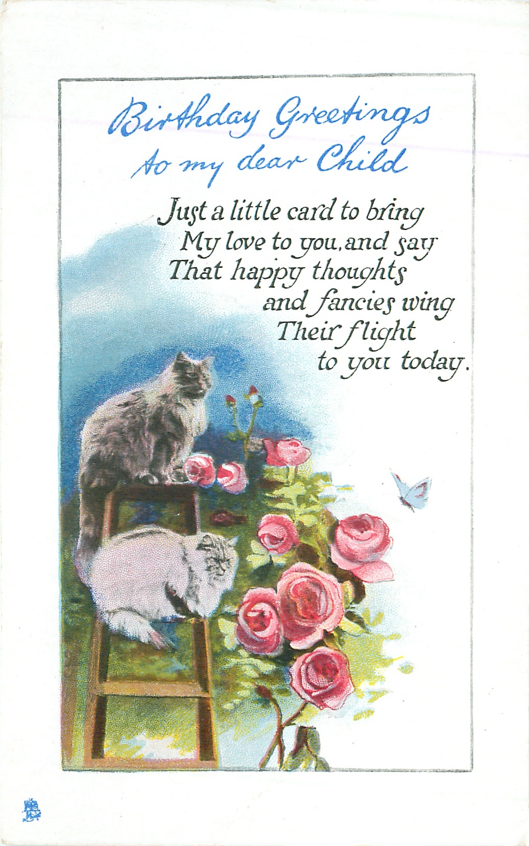 BIRTHDAY GREETINGS TO MY DEAR CHILD two cats on step ladder left, roses right, butterflies