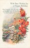 WITH BEST WISHES FOR A HAPPY BIRTHDAY vignette cottage with woman tending garden in front, deep red wallflowers right