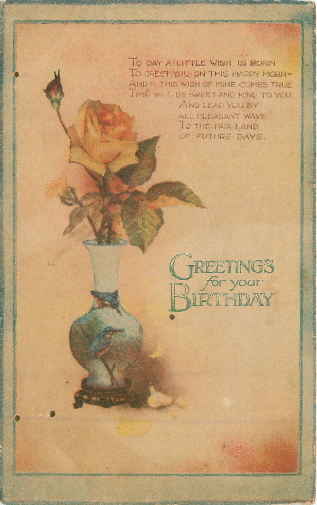 verse:- TO-DAY A LITTLE WISH IS BORN TO GREET YOU ON THIS HAPPY MORN-AND IF THIS WISH OF MINE COMES TRUE TIME WILL BE SWEET AND KIND TO YOU. AND LEAD YOU BY ALL PLEASANT WAYS TO THE FAIR LAND OF FUTURE DAYS