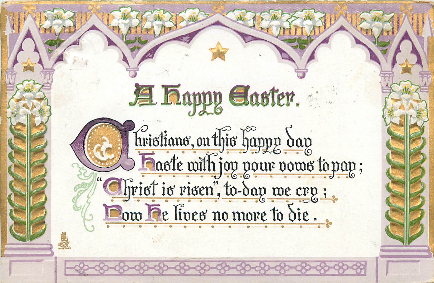 verse: CHRISTIANS, ON THIS HAPPY DAY HASTE WITH JOY YOUR VOWS TO PAY; "CHRIST IS RISEN," TO-DAY WE CRY; NOW HE LIVES NO MORE TO DIE.