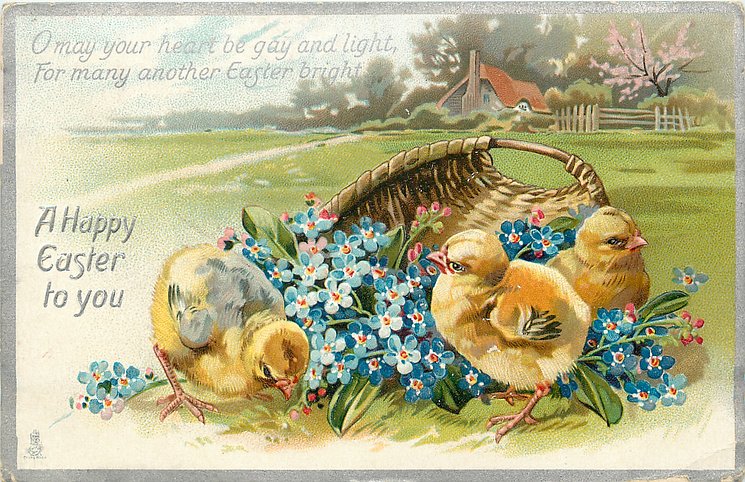 A HAPPY EASTER TO YOU with verse, three chicks next to a basket of forget-me-nots