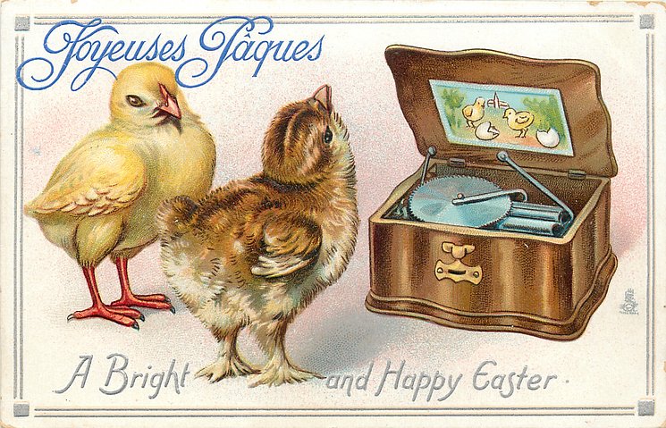 A BRIGHT AND HAPPY EASTER two chicks and gramophone