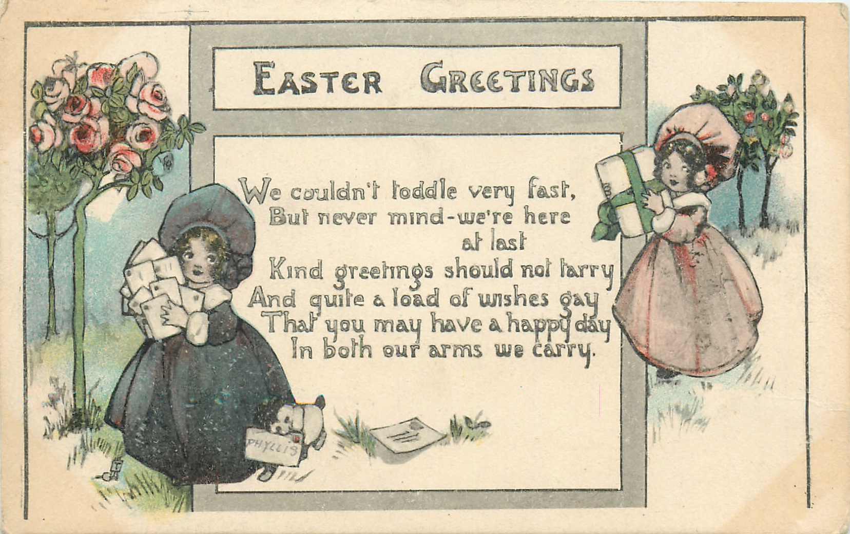 EASTER GREETINGS two bonetted girls carry presents, roses
