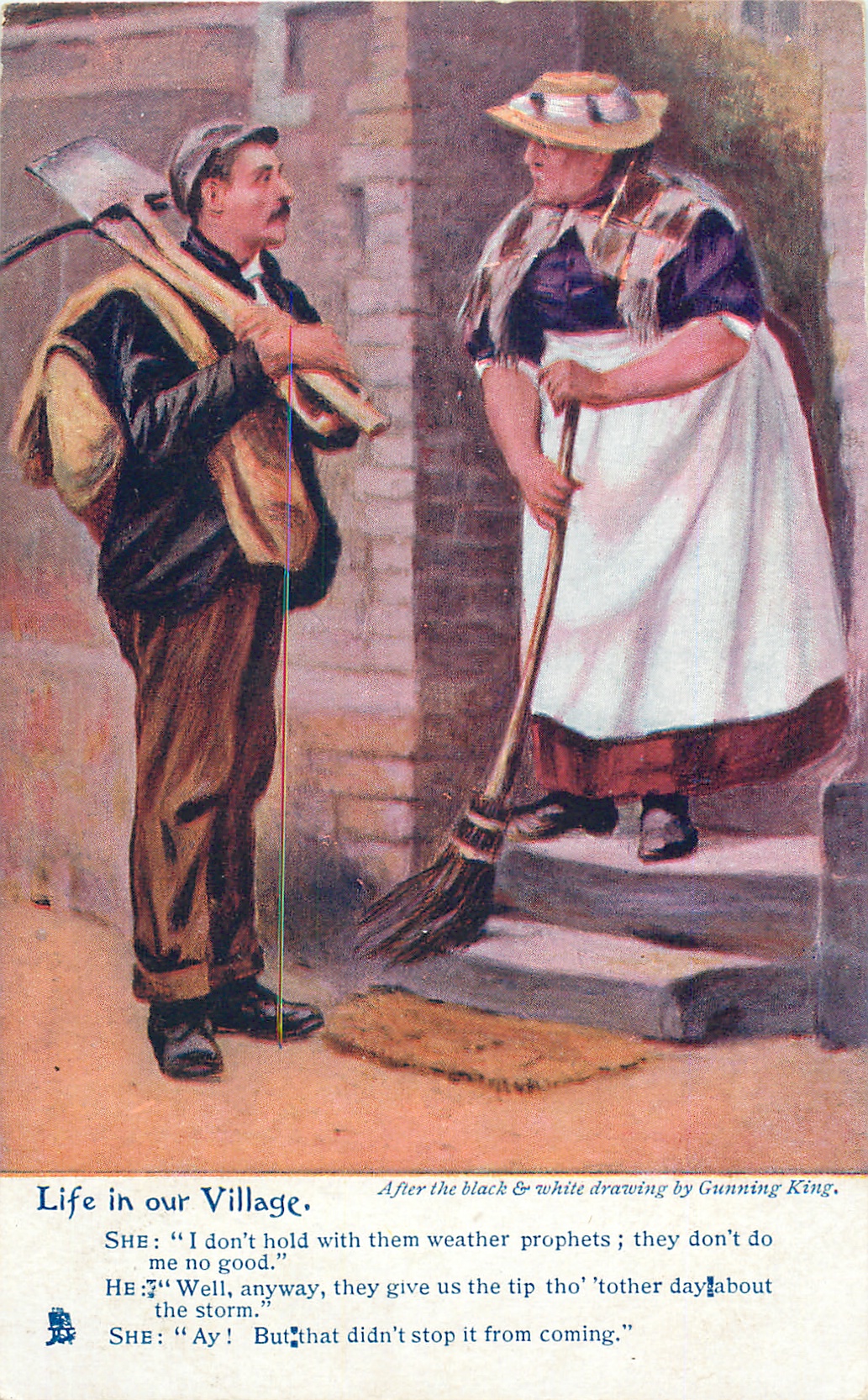 SHE: "I DON'T HOLD WITH THEM WEATHER PROPHETS; THEY DON'T DO ME NO GOOD." HE: "WELL, ANYWAY, THEY GIVE US THE TIP THO' 'TOTHER DAY ABOUT THE STORM." SHE: "AY! BUT THAT DIDN'T STOP IT FROM COMING."