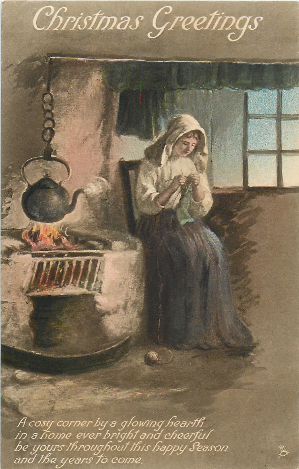 CHRISTMAS GREETINGS woman knits, kettle over fire