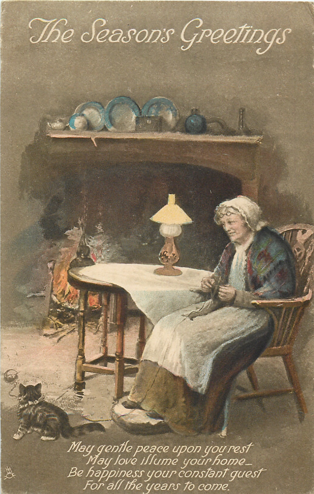 THE SEASONS GREETINGS old woman knits, kitten front left