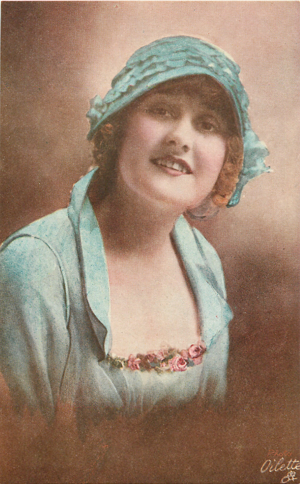 pretty woman, blue dress & hat, faces slightly right, looks front
