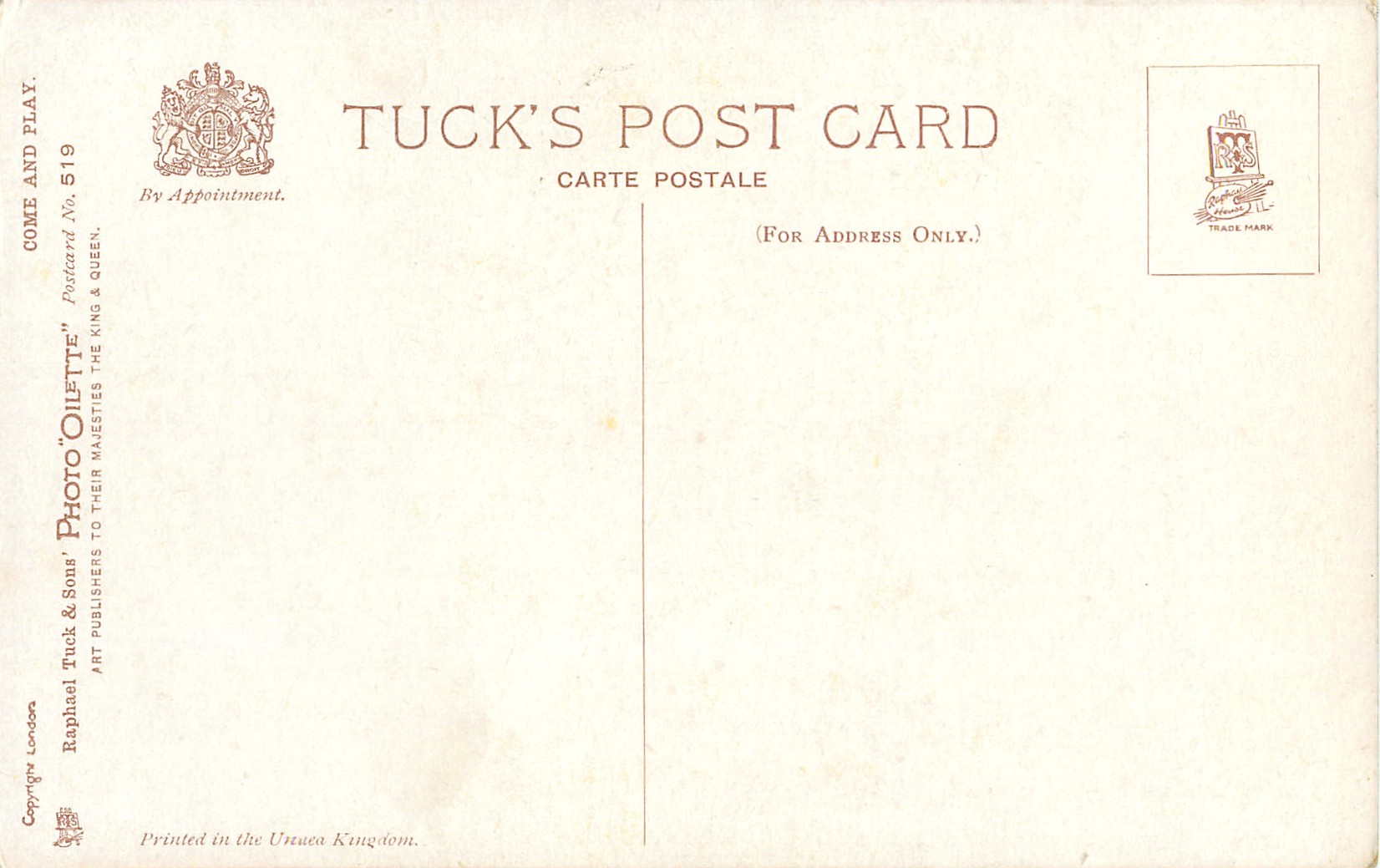 PHOTO OILETTE, PRINTED IN THE UNITED KINGDOM, COPYRIGHT LONDON. listed in1930 POSTCARD Catalogue