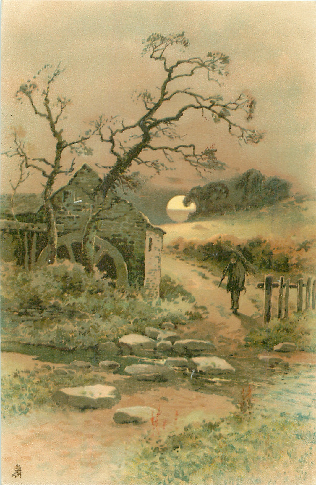 rocks in stream across road, man with load of wood walks at night, moon on horizon, derelict mill at left
