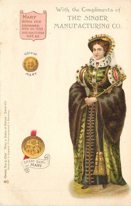 gilt, u/b, DESIGNED IN ENGLAND, CHROMOGRAPHED IN GERMANY, come with SINGER ads. on front, listed in 1904 & 1908/1909 & 1911/1912 Postcard Catalogues, although recorded we believe that these images were never made as individually numbered cards i.n. 3945-3956