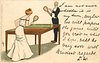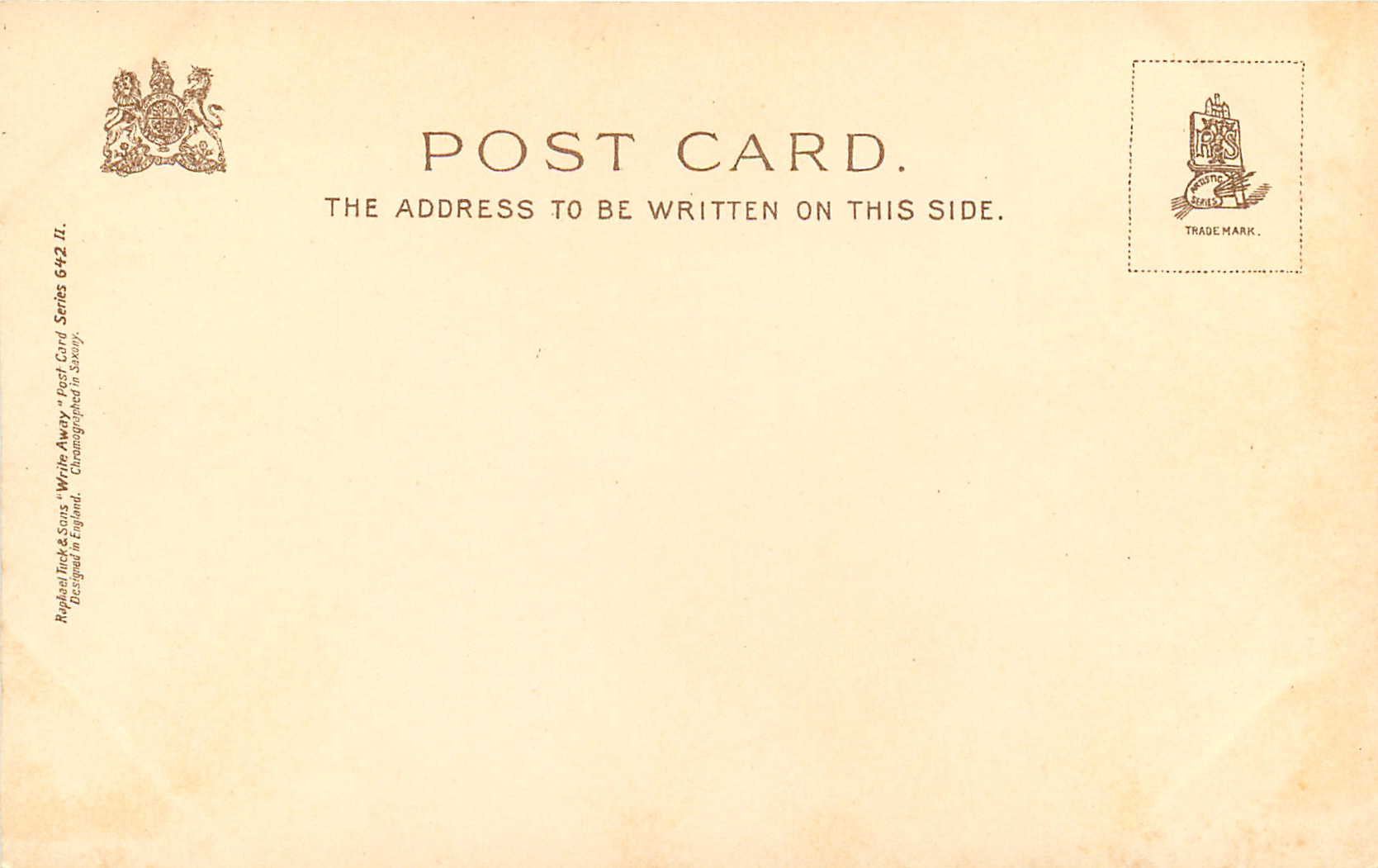 u/b (2 types), WRITE AWAY, DESIGNED IN ENGLAND, CHROMOGRAPHED IN SAXONY, listed in 1904 POSTCARD Catalogue
