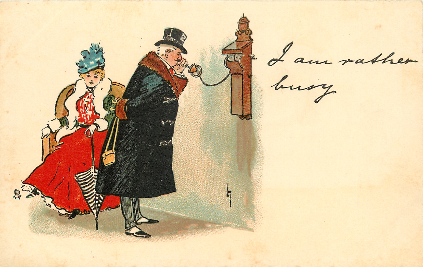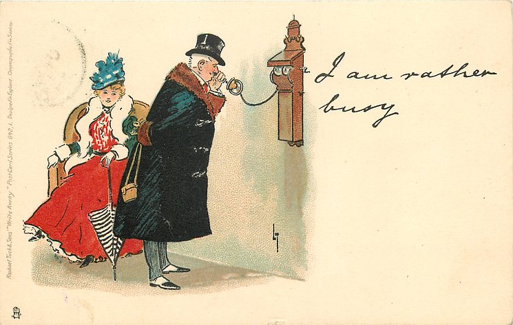 I AM RATHER BUSY man uses telephone, young lady sits behind him,