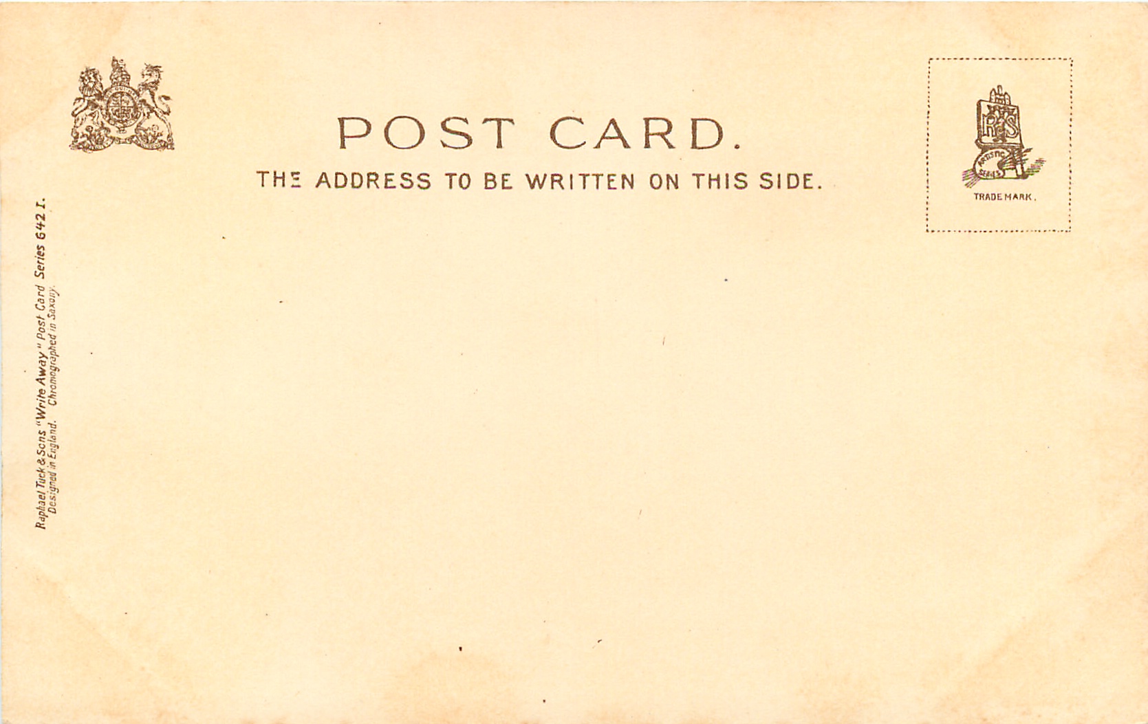 u/b (2 types), WRITE AWAY, DESIGNED IN ENGLAND, CHROMOGRAPHED IN SAXONY, listed in 1904 POSTCARD Catalogue