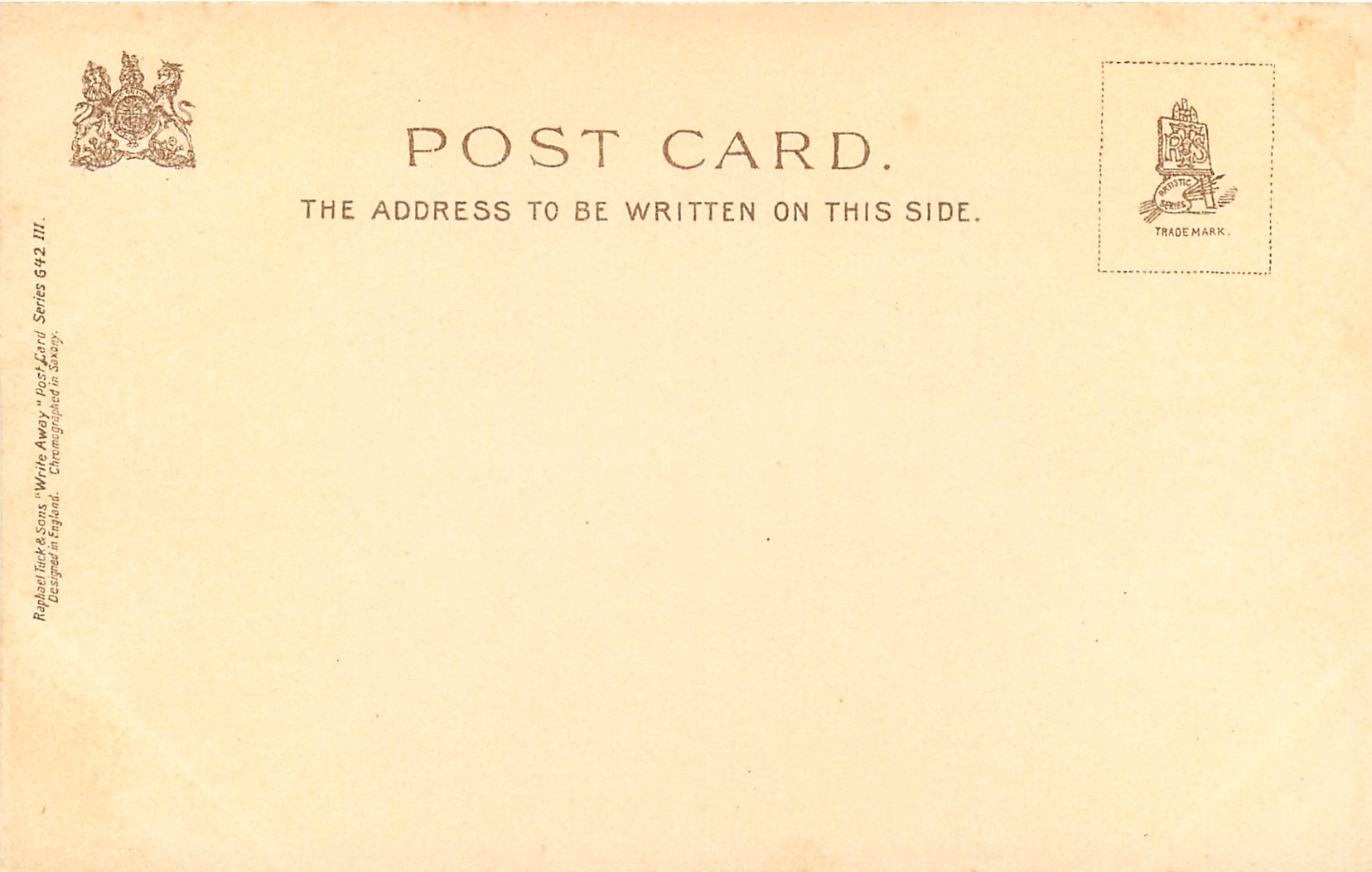 u/b (2 types), WRITE AWAY, DESIGNED IN ENGLAND, CHROMOGRAPHED IN SAXONY, listed in 1904 POSTCARD Catalogue