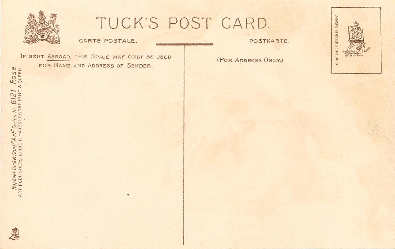ART, 3 backs, CHROMOGRAPHED IN SAXONY (in or out of stamp box), listed in 1911/1912 Postcard Catalogue, same images German backs 384B