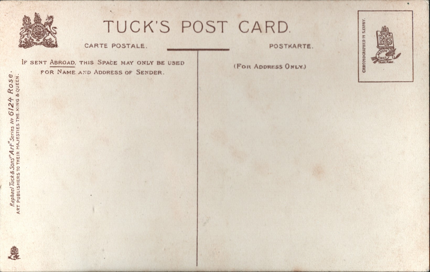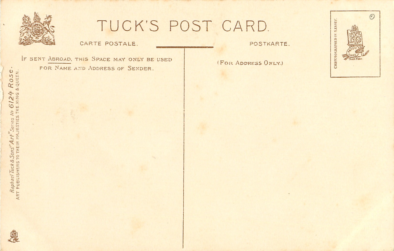 ART, CHROMOGRAPHED IN SAXONY (in or out of stamp box), deep green background, listed in 1911/1912 Postcard Catalogue