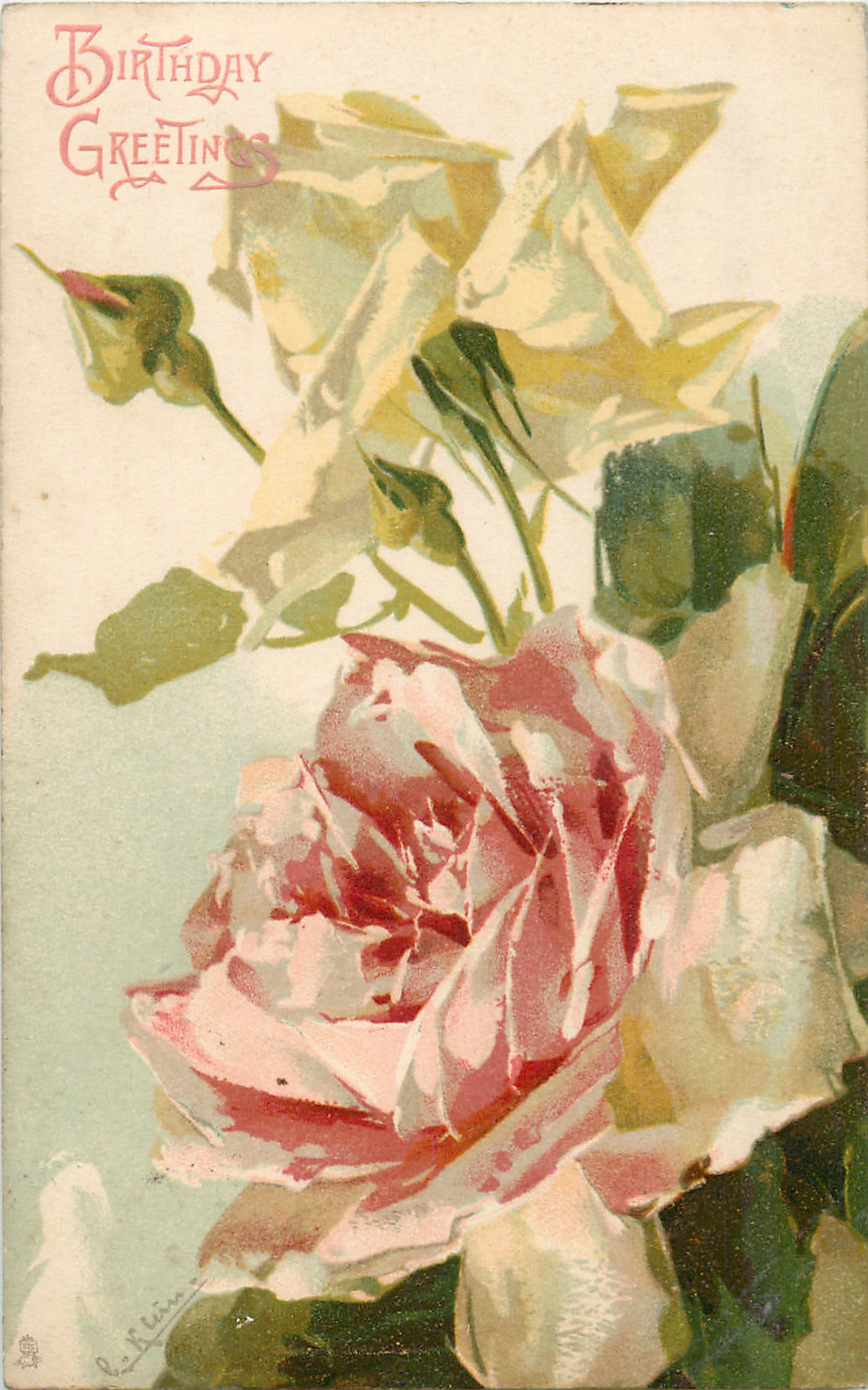large pink open rose in centre, two bud & yellow rose above, signature lower left