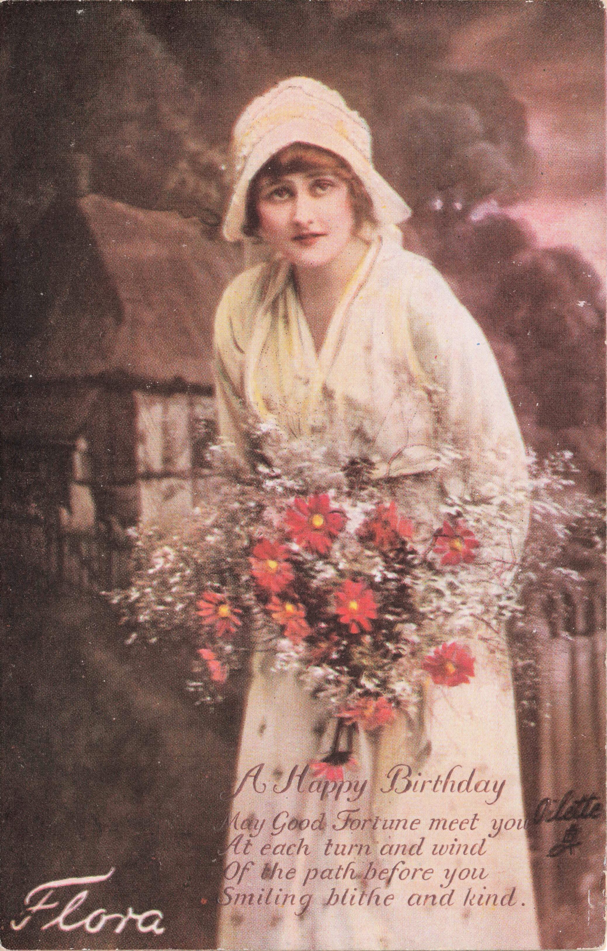 comes opt. in brown A HAPPY BIRTHDAY with verse: MAY GOOD FORTUNE MEET YOU AT EACH TURN AND WIND OF THE PATH BEFORE YOU SMILING BLITHE AND KIND.