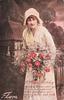 woman in yellow, white ribbons to bonnet, holds white & red flowers at waist, looks front & slightly up