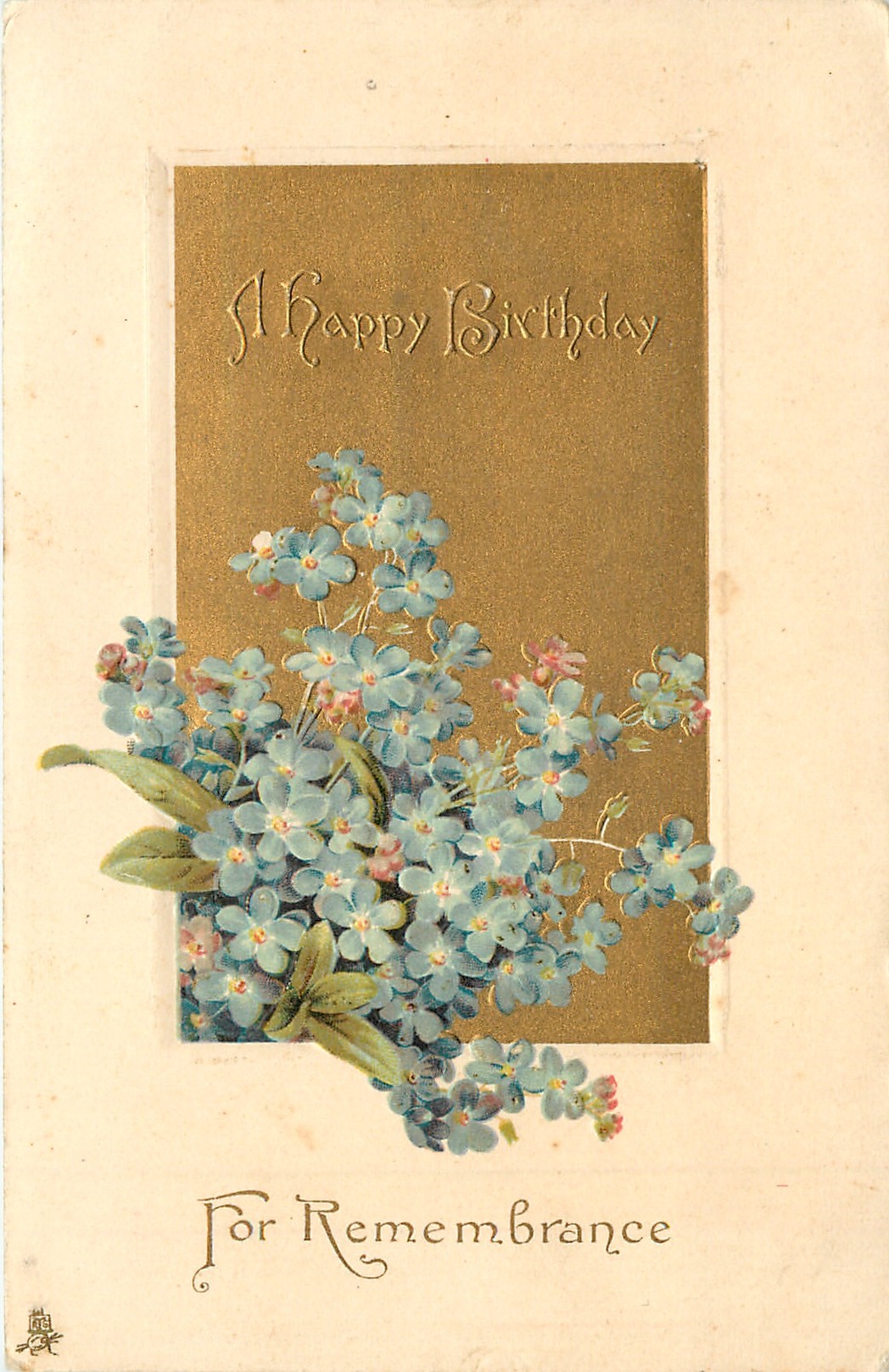 FOR REMEMBRANCE, A HAPPY BIRTHDAY blue forget-me-nots on gold background