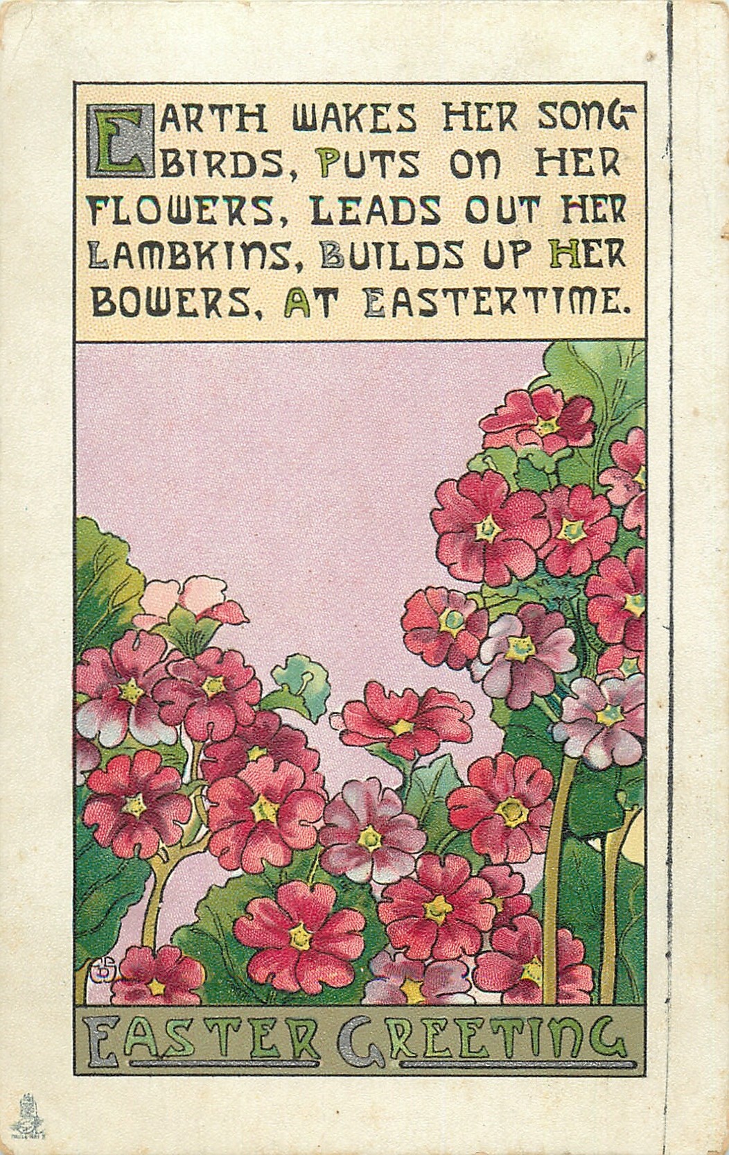 verse:- EARTH WAKES HER SONG-BIRDS, PUTS ON HER FLOWERS, LEADS OUT HER LAMBKINS, BUILDS UP HER BOWERS, AT EASTERTIME.