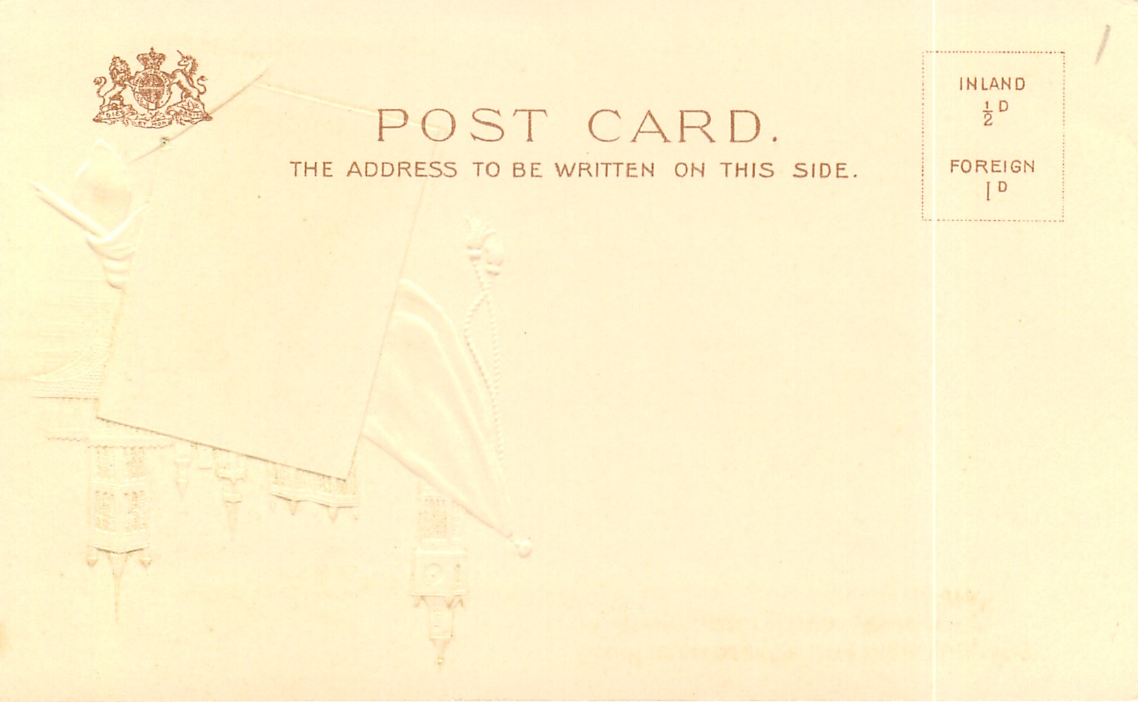u/b, embossed, DESIGNED IN ENGLAND, CHROMOGRAPHED IN BAVARIA, listed in 1904 POSTCARD Catalogue