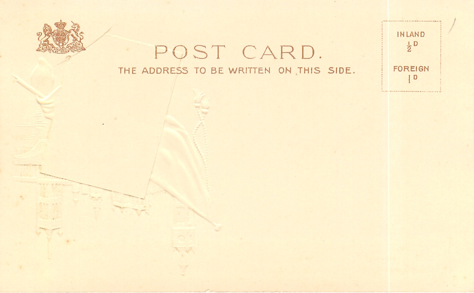 u/b, embossed, DESIGNED IN ENGLAND, CHROMOGRAPHED IN BAVARIA, listed in 1904 POSTCARD Catalogue