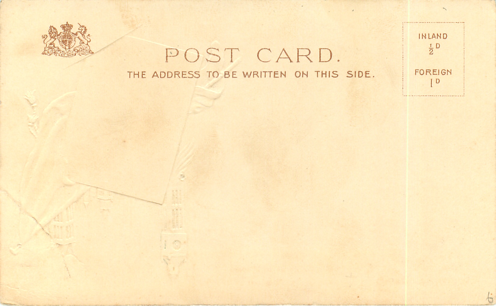 u/b, embossed, DESIGNED IN ENGLAND, CHROMOGRAPHED IN BAVARIA, listed in 1904 POSTCARD Catalogue