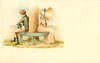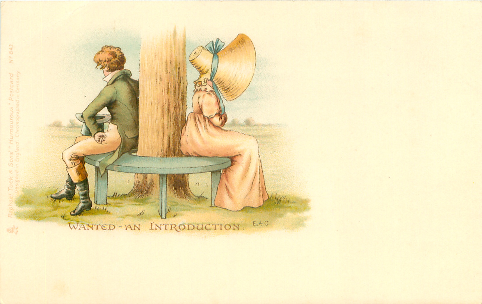 WANTED, AN INTRODUCTION girl in pink wearing huge sunbonnet & man in grey/cream riding habit sit facing away from each other on either side of tree