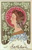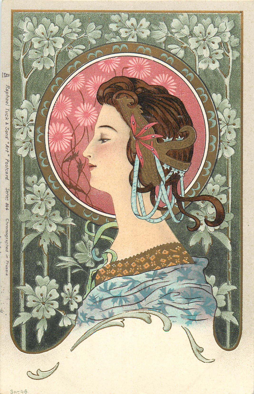 woman faces left, circular insert behind head with deep pink floral background, outside are stylised flowers